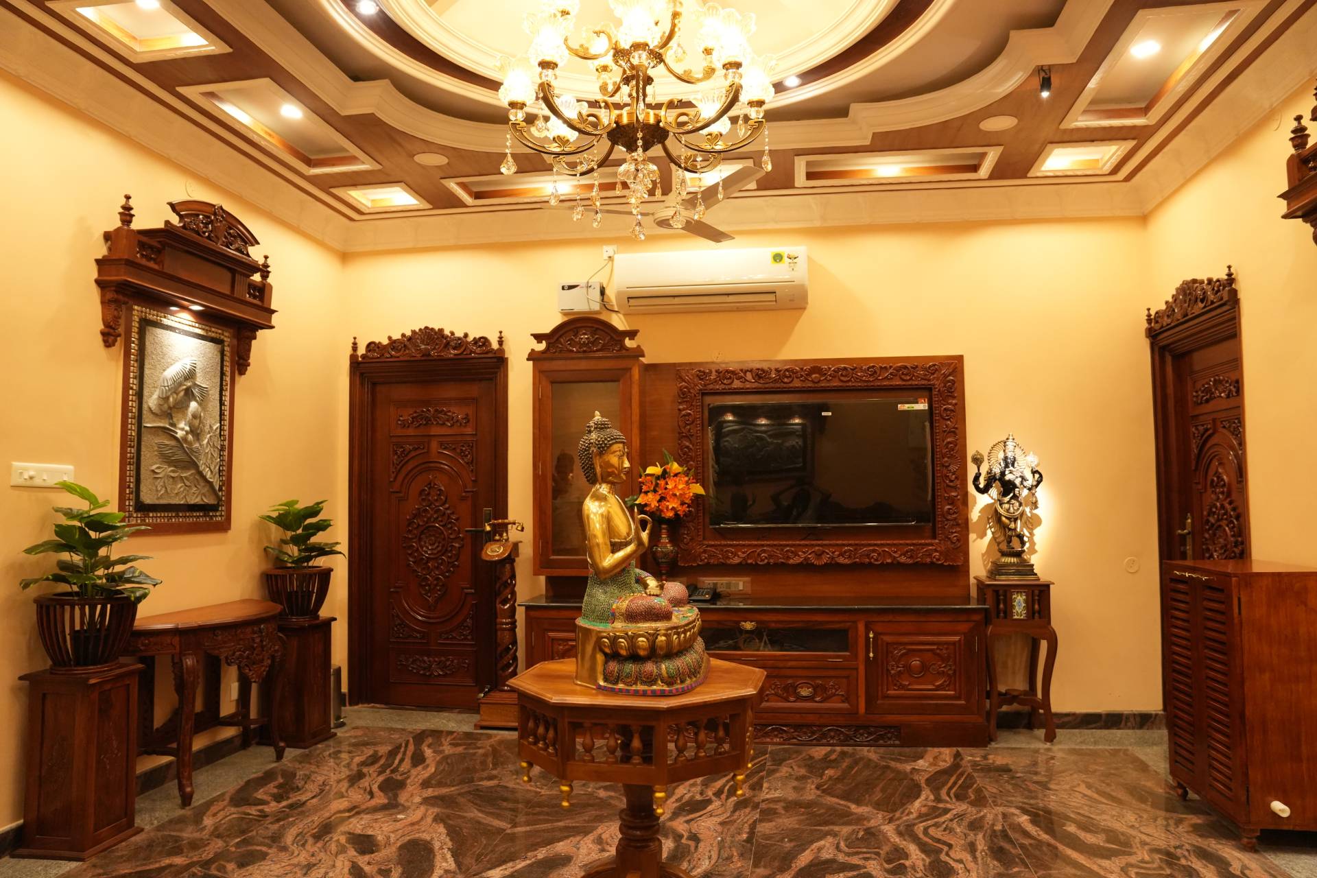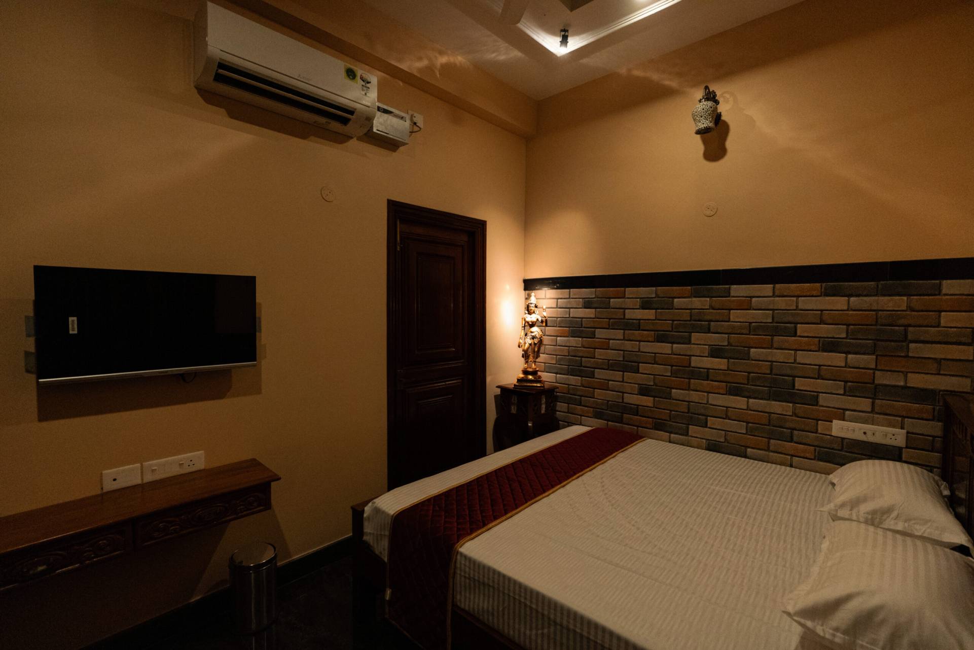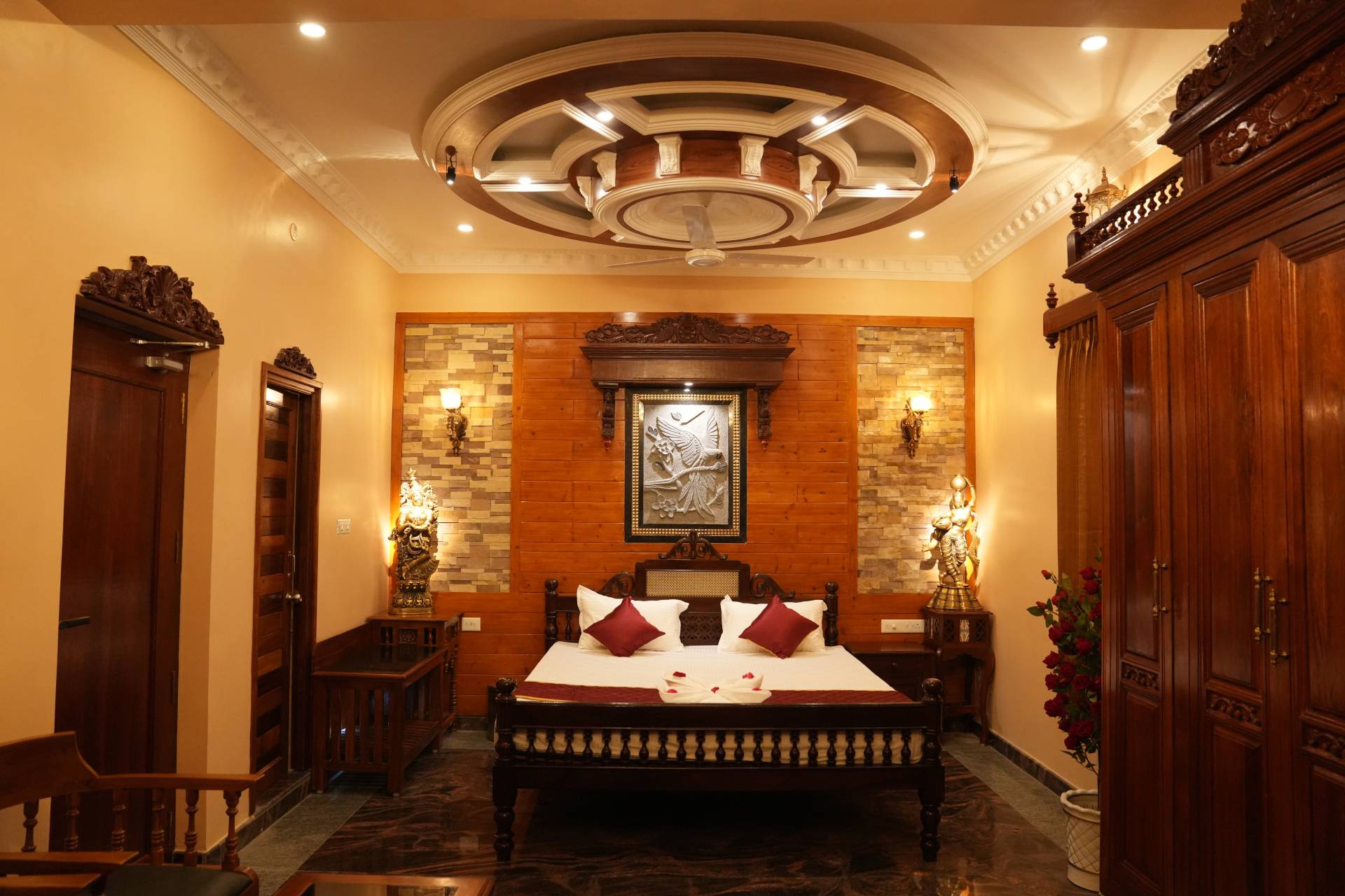 From the intricately carved wooden doors and artistic interiors to the majestic façade that stands proudly in the heart of the city, every corner of SK Grand Palace speaks of grandeur and sophistication. The warm lighting, handcrafted décor, and classical artwork create an atmosphere of calm luxury, while the spacious interiors reflect a palace-inspired design rarely found in modern hospitality.